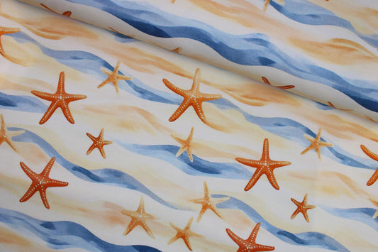Baumwolljersey Strandspaziergang Seesterne - sand/blau