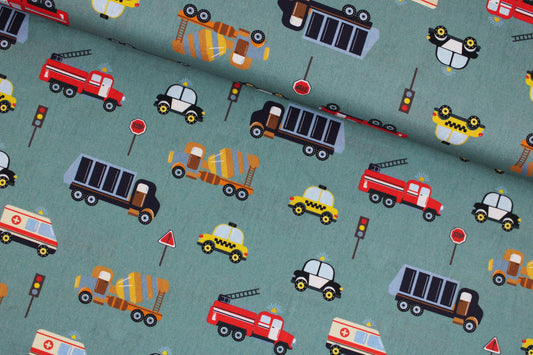 Baumwollstoff Bill Fahrzeuge - petrol/bunt