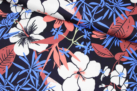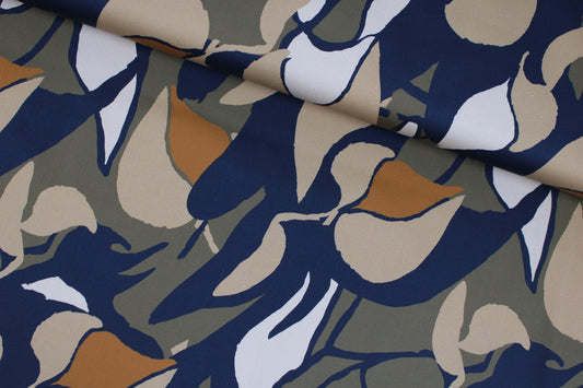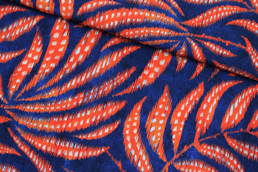 Viskosecrepe Peru Blätter - dunkelblau/orange