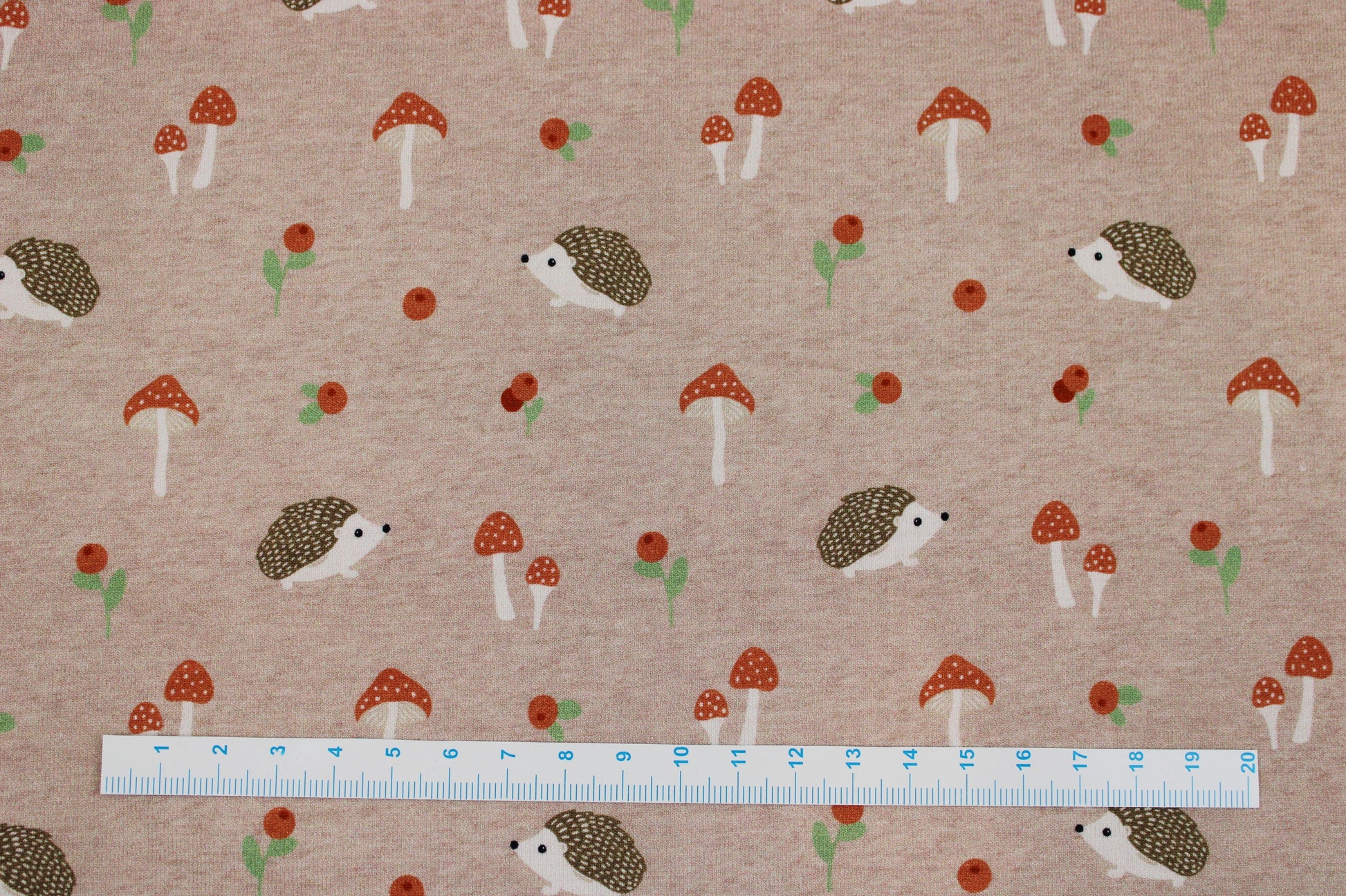 Süßer Baumwollstoff mit kleinen Igeln und Pilzen auf Beige meliertem Grund.