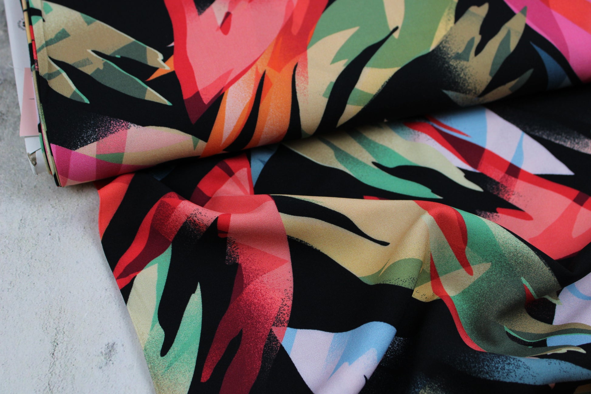 Eine schwarze Viskose mit einem Aufdruck aus bunten Blättern. Dieser Stoff eignet sich perfekt für Blusen, Kleider, Röcke... Es gibt auch eine cremefarbene Variante dieses Designs.